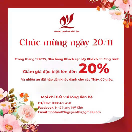 Nhà hàng - Khách sạn Mỹ Khê xin gửi lời chúc tốt đẹp nhất đến quý thầy cô – những người đã tận tâm “ươm mầm tri thức”, “chở bao lớp người sang bến bờ thành công”.